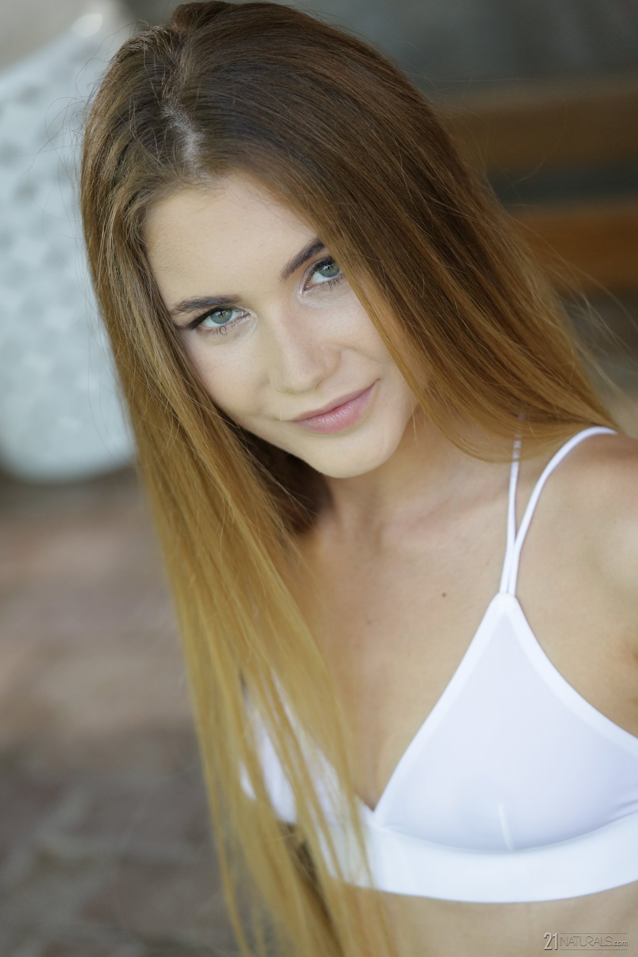 Blonde Heather with white bra and mini skirt
